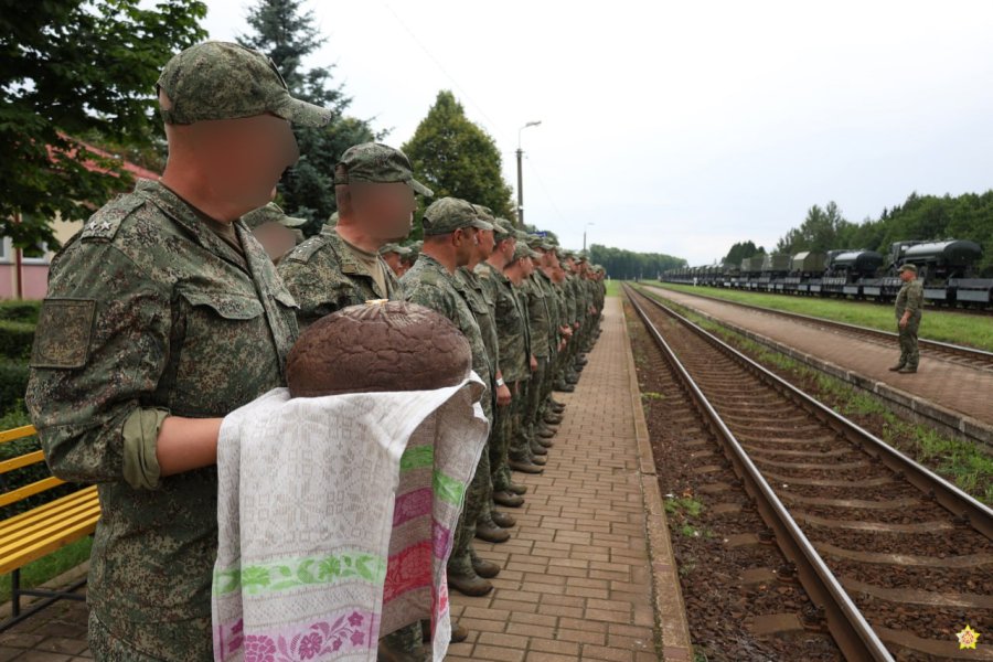 Россиян встречали с караваями, как и в 2022 году, перед нападением на Украину. Место прибытия эшелона с военной автотехникой не уточнялось, лица военных были заблюрены. В МО РБ даже заретушировали на российских вагонах номера и станции приписки.