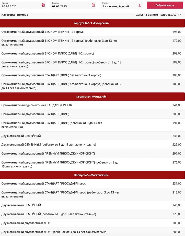 По данным официального сайта санатория, цены зависят от путевки, корпуса здравницы и категории номера. Так, по путевке «Санаторно-курортное лечение» нужно выложить от 179 до 308 рублей в сутки на одного человека. При желании можно снять целый коттедж «Беловежское предместье» — 310 рублей в сутки за одного.