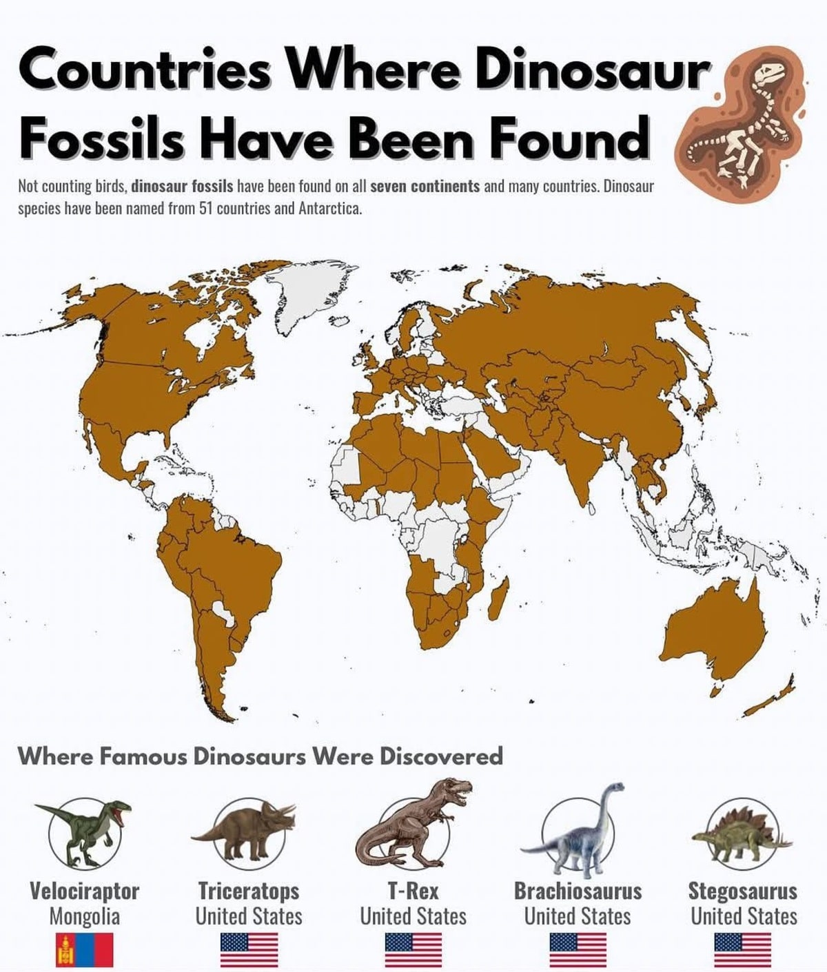 Окаменелости динозавров находили на всех континентах. Описаны виды динозавров из 51 страны и Антарктиды. По тридцать и более видов были описаны в 12 странах: Аргентина, Бразилия, Канада, Китай, Франция, Германия, Индия, Монголия, Южная Африка, Испания, Великобритания и США, пишет Naked science.