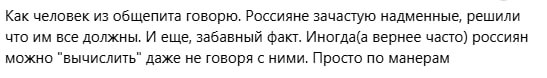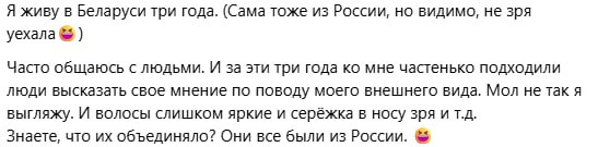 Например, одна россиянка, живущая в Беларуси три года, пишет, что чаще всего русские комментируют чужой внешний вид — волосы, украшения, одежду. Белорусы такого не делают. Другие пользователи добавляют, что россияне могут быть надменными и требовательными, а белорусы спокойные, вежливые и воспитанные.