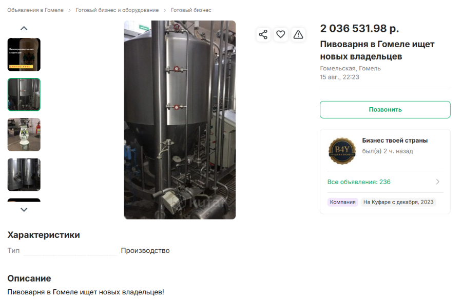 На одной из торговых площадок появилось объявление о продаже пивоварни в Гомеле с 30-летней историей.