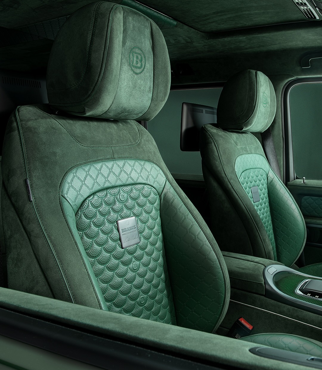 Салон «Гелендвагена» украсили зелеными кожей и замшей. Также добавили карбоновые вставки.