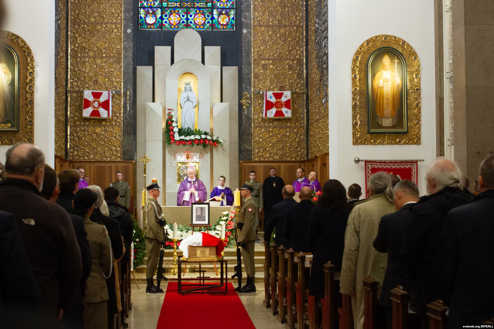 Пасьля жалобнай імшы ў Катэдральны касьцёле Войска Польскага труну з прахам пісьменьніка перапахавалі на вайсковых могілках Павонзкі ў цэнтры Варшавы.