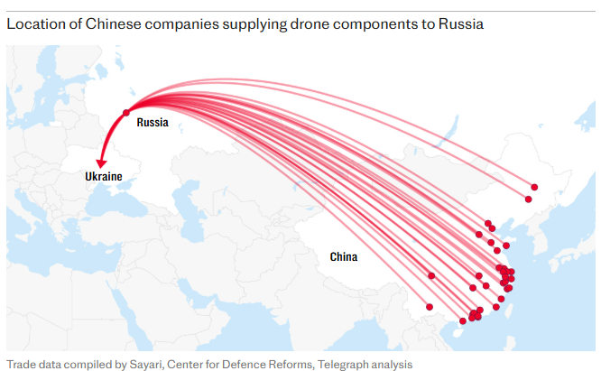 Китай официально декларирует нейтралитет, но поставки компонентов говорят о тесном военном сотрудничестве с Россией. Украинские военные находят китайские детали на сбитых российских дронах. Один из украинских пилотов отметил: «У нас постоянно появляются платы и чипы, которые явно из Китая, с китайскими надписями».