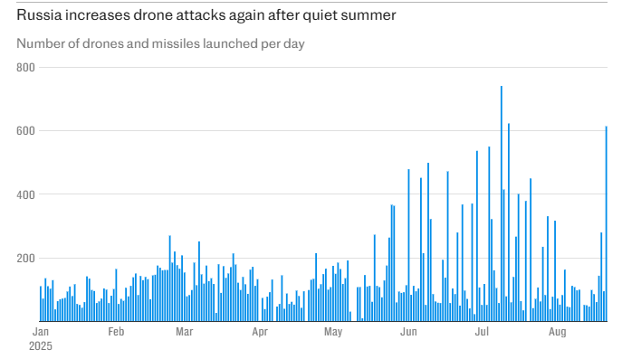 Несколько дней назад Москва запустила около 600 дронов за одну ночь - это второе по масштабу воздушное нападение со времени вторжения в феврале 2022 года.