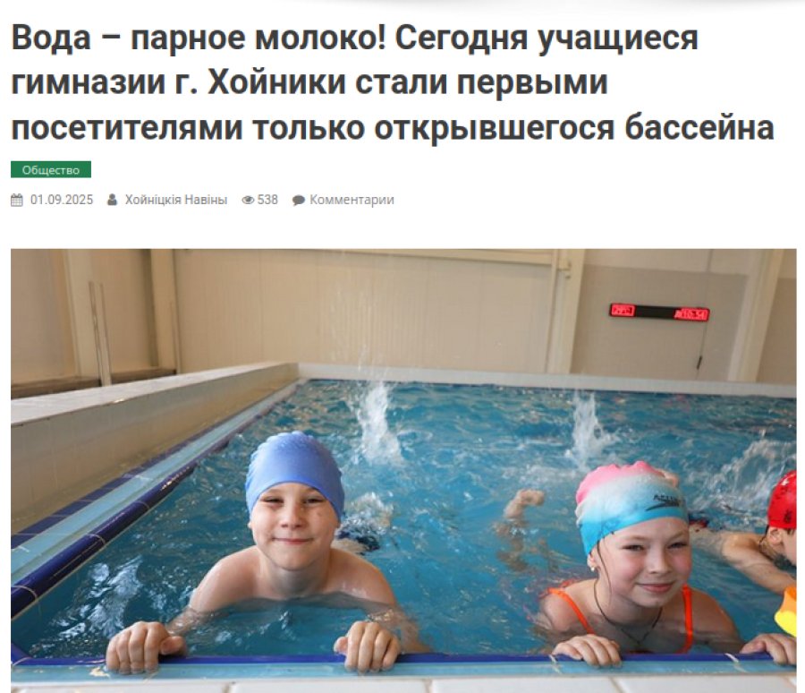 Центральным мероприятием 1 сентября в Гомельской области было открытие бассейна при гимназии в Хойниках, сообщает «Флагшток». Чтобы громко заявить об очередном «подарке» властей местным жителям, в райцентр прибыли председатель облисполкома Иван Крупко и заместитель премьер-министра Наталья Петкевич.