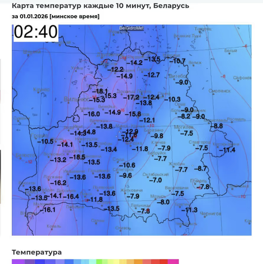 В Новогоднюю ночь температура до -18°C опустилась на северо-западе Беларуси в районе Лынтуп и Новосёлок. В Минске зафиксировали около -20° C. Об этом свидетельствуют данные Белгидромета (Белорусский государственный гидрометеорологический центр). В остальном же температура колебалась от -7°C на востоке и в среднем была -10…-16°C в центре и на западе, пишет «Телеграф».