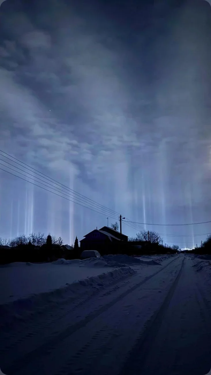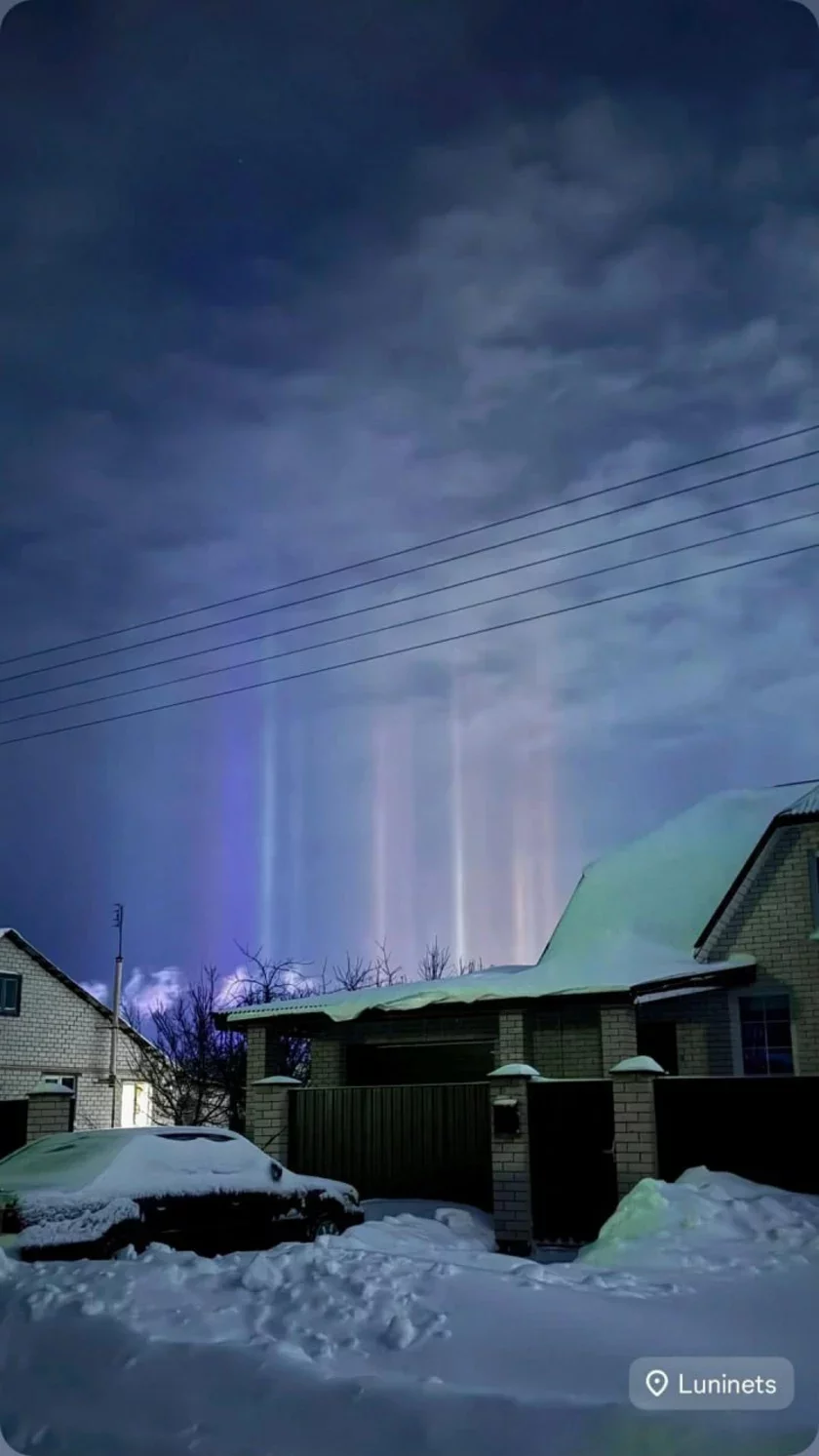 Вот такие световые столбы наблюдали в ночном небе в Лунинце.