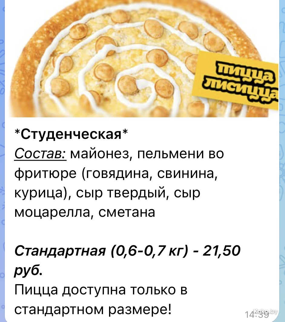 «Пицца-лисица» представила пиццу с пельменями, пишет Koko.by. Она называется «Студенческая».