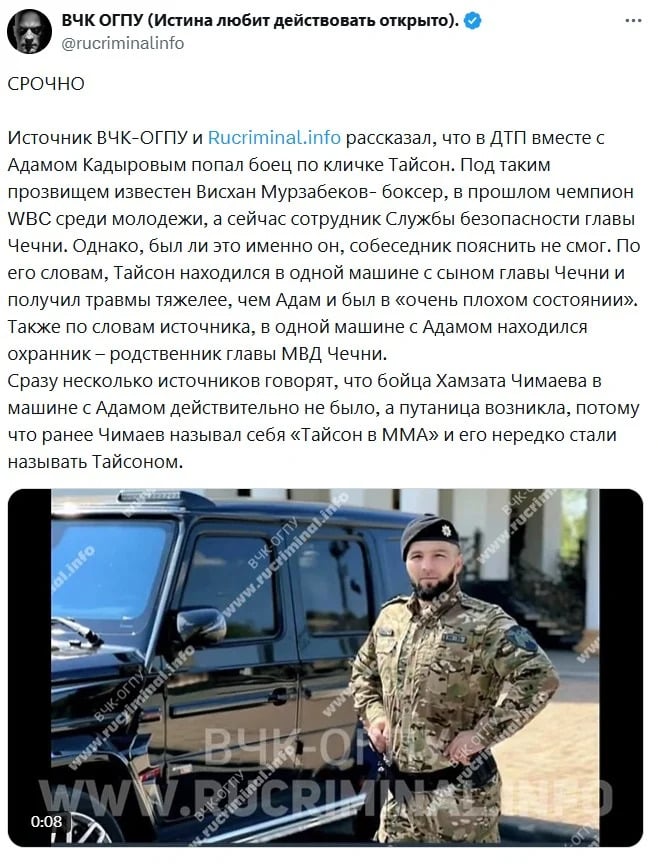 В сообщении говорится, что упомянутый боксер находился в одной машине с Адамом Кадыровым и получил более серьезные травы, чем сын главы Чечни. По словам источника, он был «в очень плохом состоянии» после аварии.
