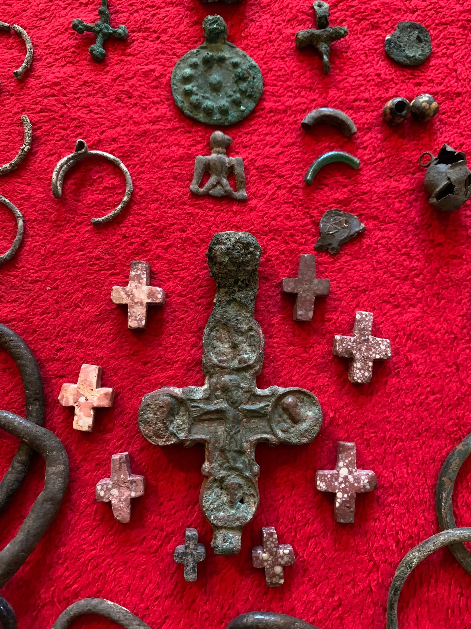 Помимо браслетов, археологи нашли десятки предметов роскоши и культовых артефактов: массивный энколпионовый крест, бронзовые и мраморные нательные кресты, серебряные височные кольца, кольцо-печатку, пряжки с декоративной отделкой, элементы с изображением трезубца и сокола, а также бронзовый наконечник булавы. Многие предметы связаны с элитарной религиозной и торговой культурой домонгольской Руси.