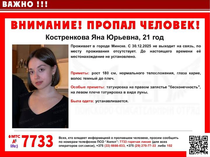 Уже несколько дней в Минске ищут 21-летнюю Яну Костренкову, которая таинственным образом пропала в центре города. Девушка — дочь директора крупного агрокомплекса. Последний раз на связь она выходила 30 декабря, с тех пор близким не известно о ее местонахождении. Ориентировку о пропаже Яны разместил поисково-спасательный отряд «Ангел» 3 января, пишет «Зеркало».