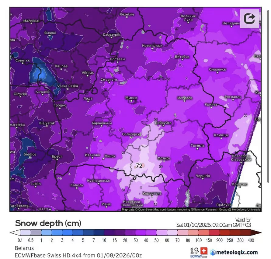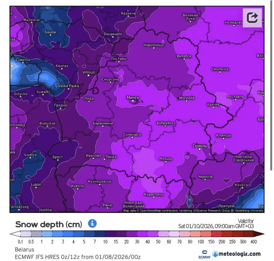 Что касается расчетов модели WRF от Белгидромета (Белгидромет — Белорусский государственный гидрометеорологический комитет), то на завтра, 9 января, к полудню к юго-востоку от Минска, где-то на стыке Минской, Могилевской и Гомельской областей, она также прогнозирует много снега. Высота снежного покрова достигнет 50 см.