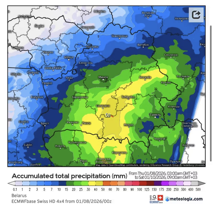 Согласно модели ECMWFbase Swiss HD 4x4, самые сложные погодные условия в Беларуси будут с 8 по 9 января. За это время в стране выпадет до 1–1,5 месячной нормы осадков. В первую очередь — по востоку Брестской, западу Гомельской, юго-востоку Минской и юго-западу Могилевской областей. Об этом сообщил метеорологический канал «Метеовайб», заметил сайт telegraf.