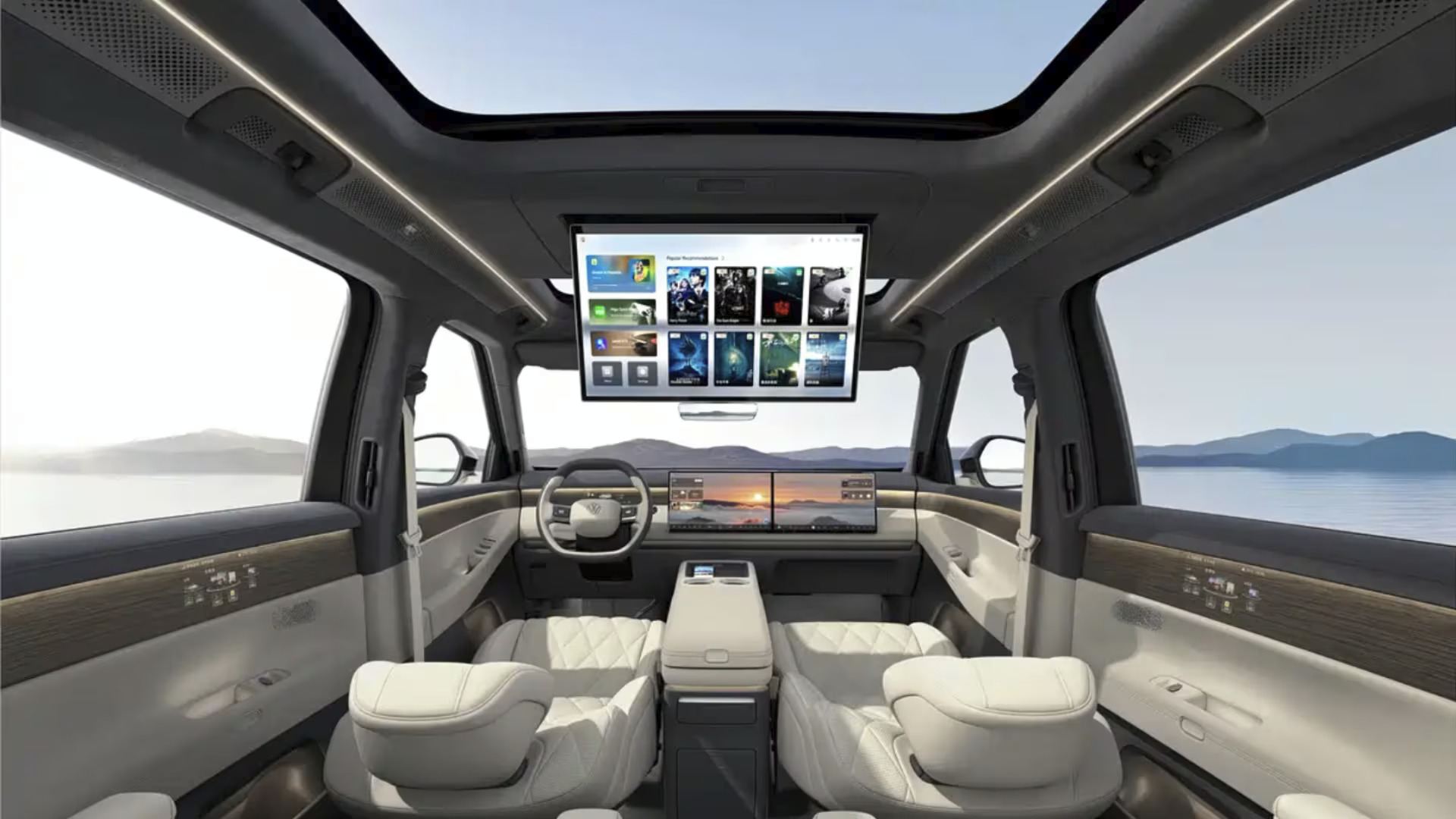 Главная особенность — две 15,6-дюймовые UHD-панели для водителя и переднего пассажира. На втором ряду внимания не меньше: для задних пассажиров предусмотрен огромный 21,4-дюймовый потолочный экран, обеспечивающий «кинотеатр в салоне». Концепция «равного комфорта» делает все шесть мест максимально технологичными.