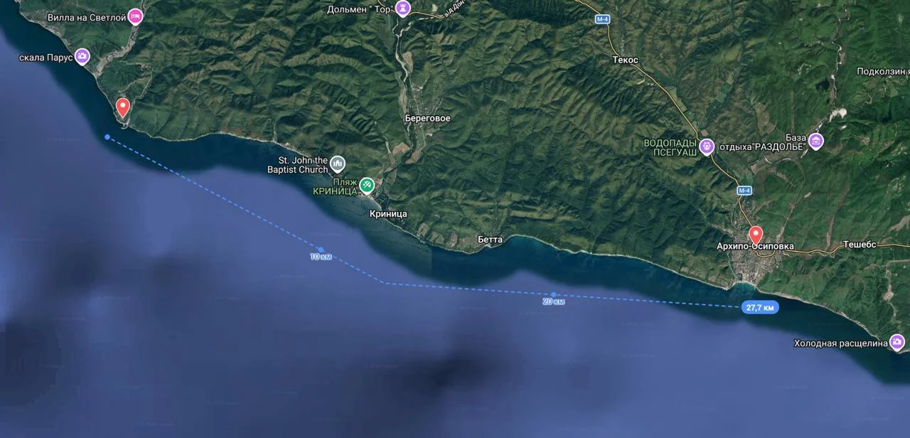 Загрязнение зафиксировали возле села Архипо-Осиповка, которое входит в состав Геленджика. На снимке, сделанном 25 апреля, северный край пятна был возле поселка Новомихайловский в 25 км от Туапсе.