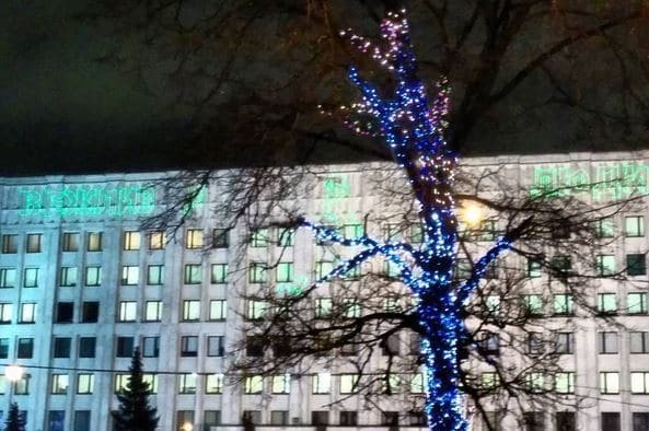 В Москве на фасаде здания Министерства обороны России появилась новогодняя иллюмнация в виде надписи "Вежливые люди".