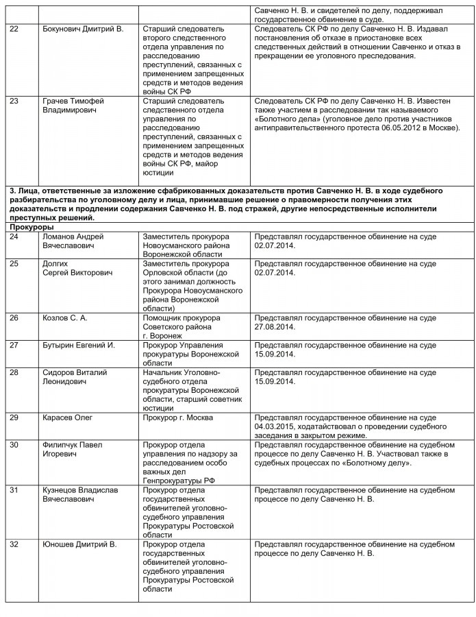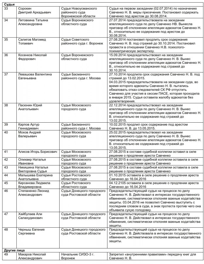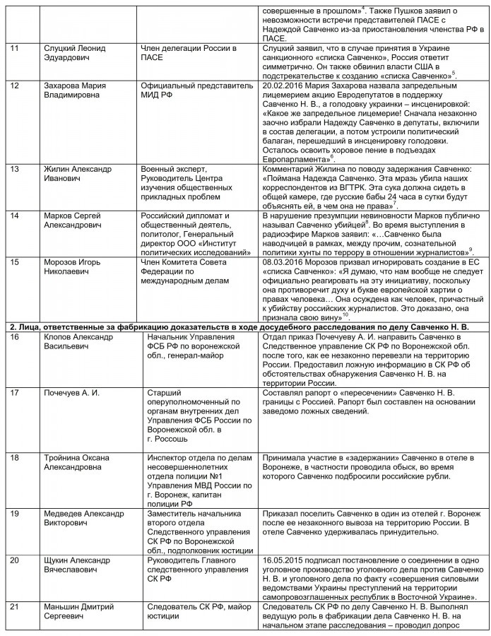 В прилагаемом Илларионовым списке содержится 49 фамилий, среди которых лица, ответственные за политическое решение об угоне, вывоз на территорию РФ, незаконное содержание и фабрикацию дела Савченко, а также лица, ответственные за политическую легитимизацию в глазах международной общественности действий РФ в отношении летчицы.