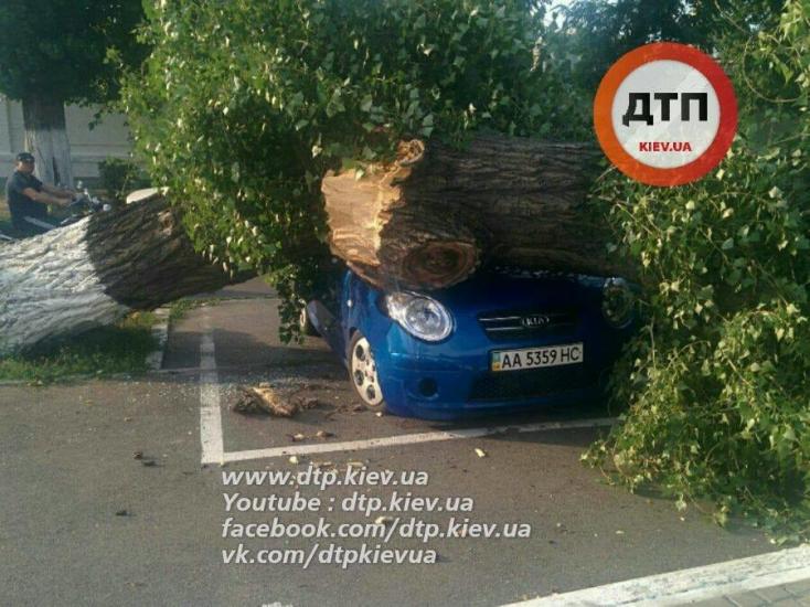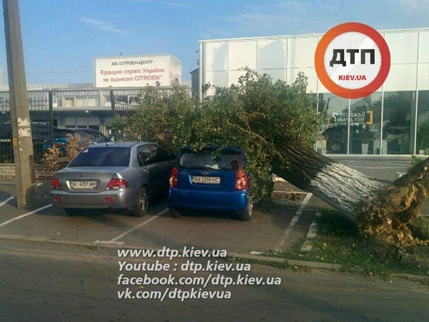 В Киеве старый тополь упал на припаркованные легковые автомобили KIA и Mitsubishi.
